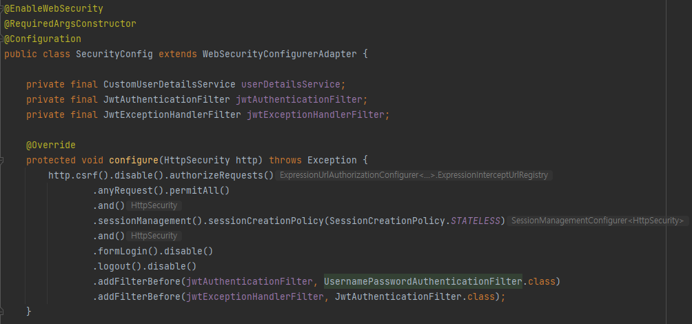 위 코드와 같이 설정하면 필터가 동작하는 순서는 JwtExceptionHandlerFilter → JwtAuthenticationFilter → UsernamePasswordAuthenticationFilter 가 됩니다.