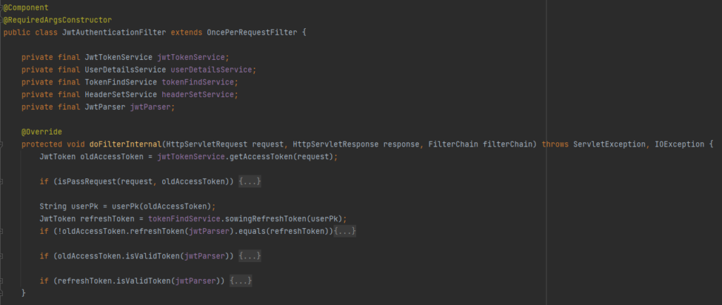 JwtAuthenticationFilter에서 클라이언트의 요청에 포함되어 있는 AccessToken이 유효한 토큰인지 확인합니다.
