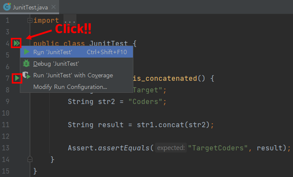 방법 1. 아래 사진처럼 class, method 선언 옆에 표시된 아이콘(재생 모양)을 클릭하여 Run ‘JunitTest’을 선택한다.