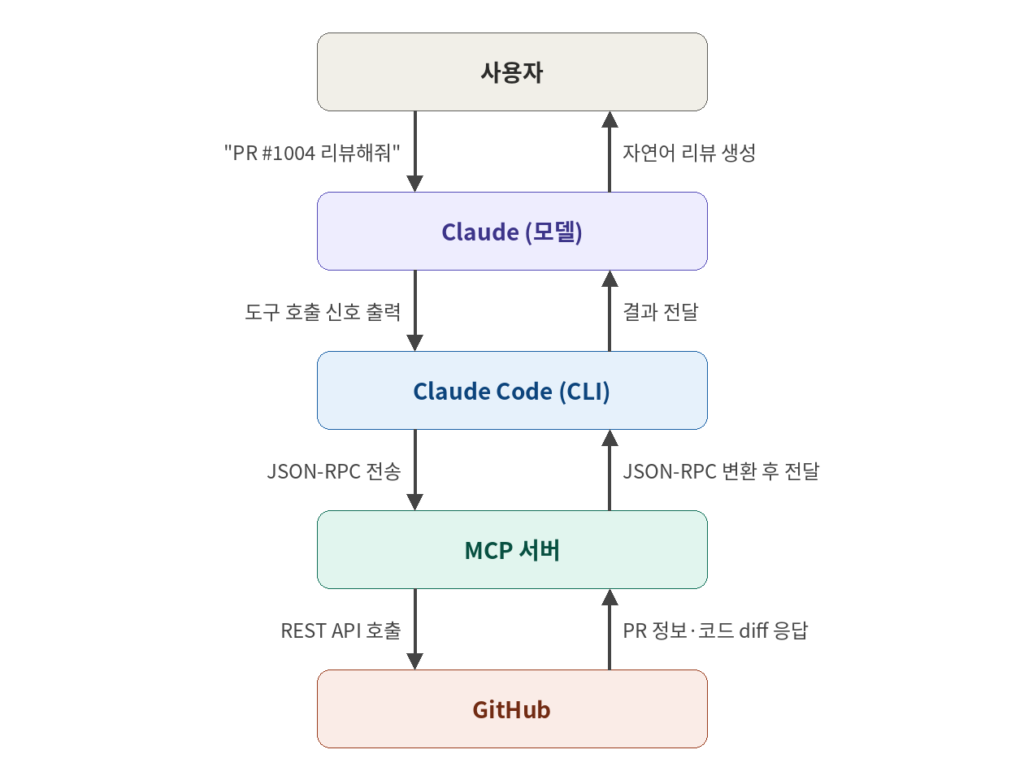 사용자 눈에는 질문하고 답변을 받는 것처럼 보이지만, 그 사이에 Claude ↔ Claude Code ↔ MCP 서버 ↔ GitHub API 왕복이 보이지 않는 곳에서 여러 번 일어나고 있는 것입니다.