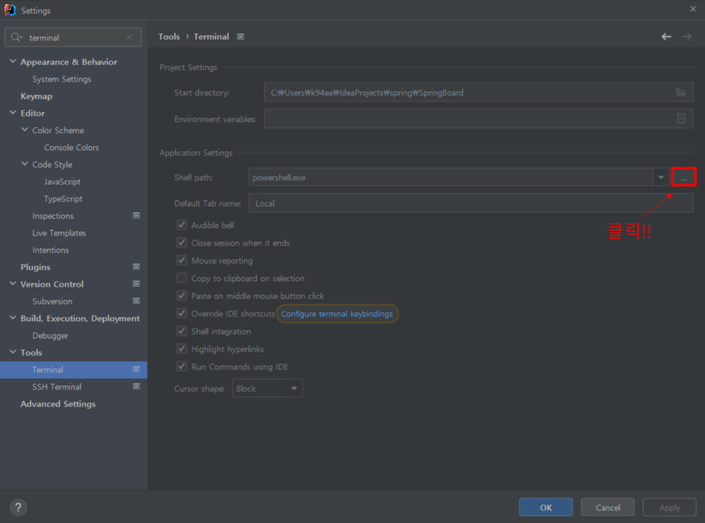 6. IDE에서 Git 사용을 편리하게 하기 위해 터미널 설정을 변경해줍니다. 단축키 [Ctrl] + [Alt] + s 를 누르면 Settings 창을 띄울 수 있습니다. Setting에서 terminal을 검색하여 Tools 아래의 Terminal로 이동해주세요. Shell path 우측의 … 버튼을 클릭합니다.