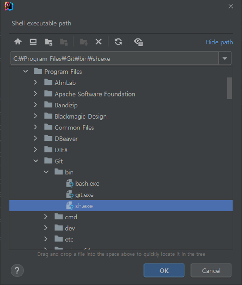 7. git이 설치된 경로로 이동하여 sh.exe를 선택해주세요.