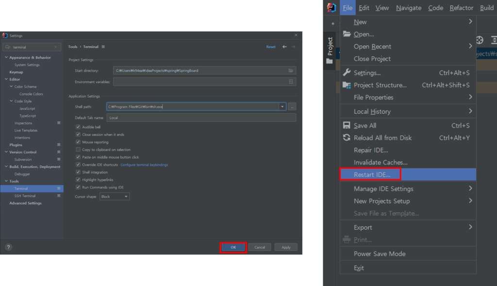 8. OK를 클릭하고, 적용된 것을 반영하기 위해 IntelliJ를 재시작 합니다.