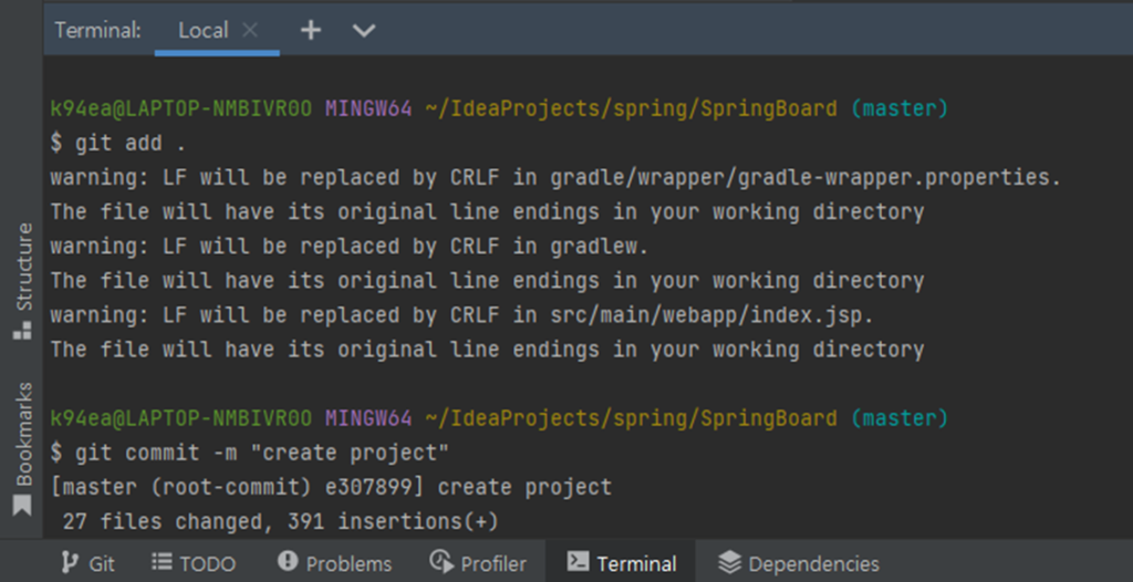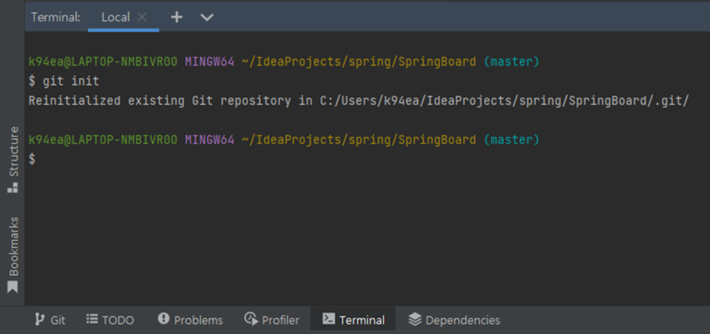 9. 재시작이 완료되면 좌측 아래쪽에서 Terminal 탭을 클릭해보세요. Git Bash가 적용된 것을 볼 수 있습니다. 기본 경로가 프로젝트 폴더이므로 명령어 git init 을 입력하여 형상 관리를 시작하세요.
