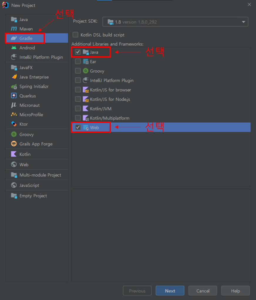2. Gradle, Java, Web을 선택해주고 Next 버튼을 클릭합니다.
