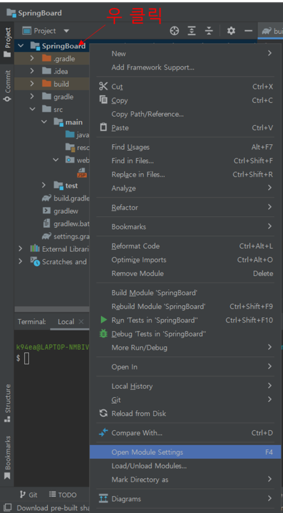 11. 프로젝트 생성 직후 facet 설정이 어떻게 되어 있는 지 살펴보기 위해 Project Setting을 열어보세요. 프로젝트 폴더 우클릭 후, Open Module Settings를 클릭합니다.