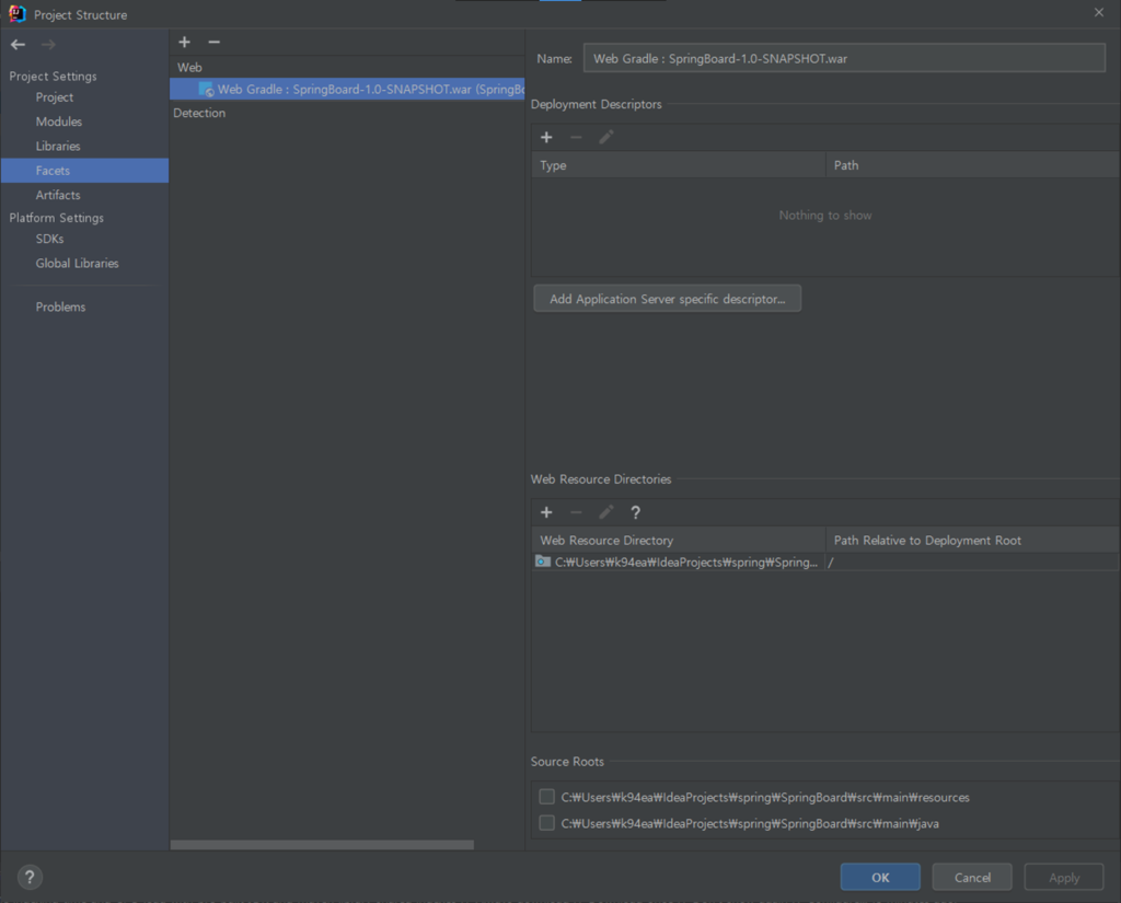 12. facets 탭을 눌러보면 아래와 같은 화면을 볼 수 있습니다. Web Gradle로 시작하는 것을 보면 Gradle로 빌드 하는 경우에 대한 설정임을 알 수 있습니다. Deployment Descriptors 아래에 web.xml 설정 파일을 추가해줘야 하는데, 현재 프로젝트의 webapp 아래에는 web.xml이 없어 추가할 수 없습니다.