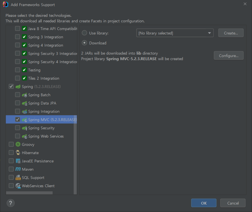 14. 아래와 같은 창이 뜨는데, 아래로 스크롤 하여 Spring과 Spring MVC를 체크한 뒤 OK 버튼을 클릭하세요.