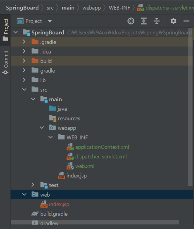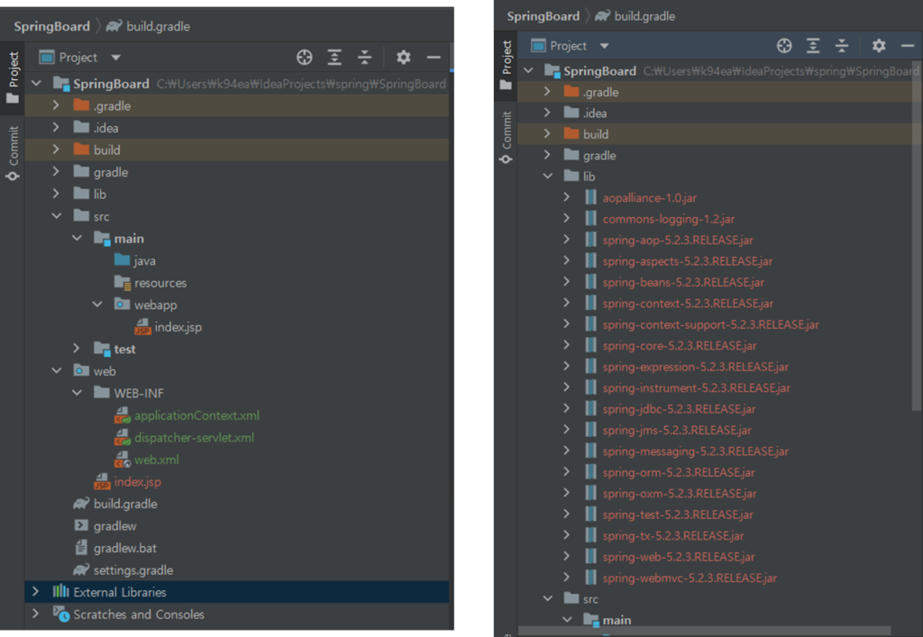 17. 어떤 변화가 생겼는지 살펴볼까요? lib 디렉터리에 jar 파일들이 추가되었네요. 그리고 web 폴더, 그리고 그 아래에 WEB-INF 폴더가 생겼습니다. 그 안에 xml 파일들이 있어요. IntelliJ는 Gradle 빌드 기준이 아닌, 기본 Java 빌드 기준으로 폴더 구조를 만들어 주고 있습니다. 우리는 빌드 툴로 Gradle을 사용하기 때문에 이런 폴더 구조로는 설정 파일과 함께 정상적으로 빌드할 수 없습니다.