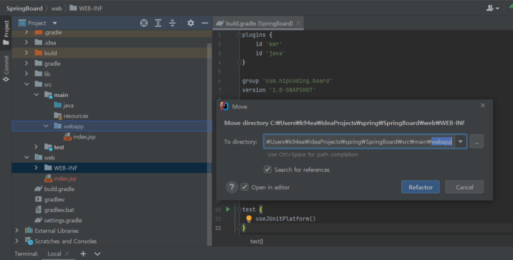18. 자동으로 생성된 WEB-INF 폴더를 webapp 아래로 옮겨주세요. WEB-INF 폴더 위에서 마우스 왼쪽 클릭 한 채로 드래그 하여 webapp 폴더 위에서 드롭하면 다음과 같은 창이 뜨고, Refactor 버튼을 클릭하여 폴더를 이동합니다.