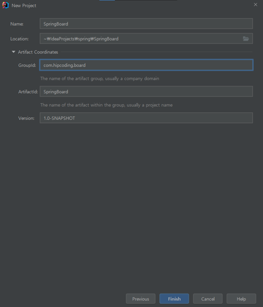 3. 아래를 참고하여 값을 입력한 뒤 Finish 버튼을 클릭합니다.