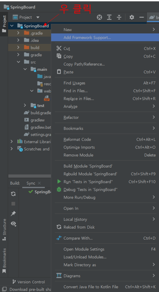 13. IntelliJ Ultimate는 다양한 프레임워크의 facet 설정을 쉽게 할 수 있도록 기능을 지원합니다. 프로젝트 폴더를 우클릭 해서 ‘Add Framework Support…’ 를 클릭하세요.