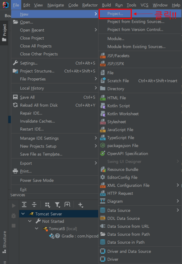 - IntelliJ를 열고 아래의 방법 중 하나로 New Project 창을 띄워주세요.